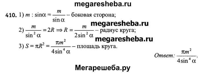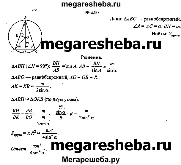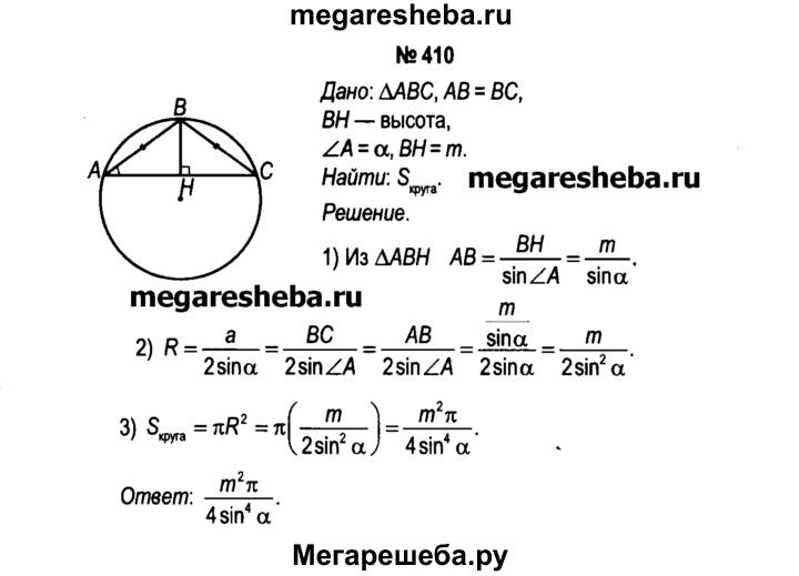410. Градусная мера угла при основании равнобедренного треугольника равна α, а высота, проведенная к основанию, — m. Найдите площадь круга, ограниченного окружностью, описанной около этого треугольника.