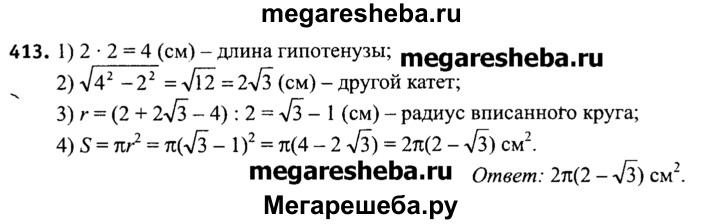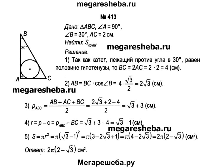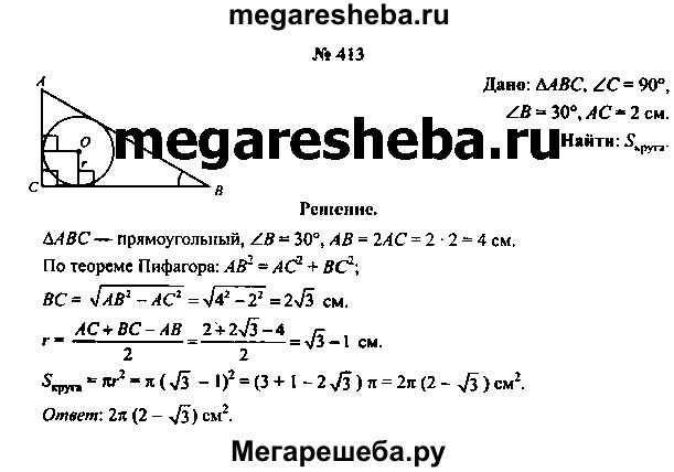 413. Вычислите площадь круга, вписанного в прямоугольный треугольник, если градусная мера его угла равна 30°, а длина катета, лежащего против этого угла, равна 2 см.