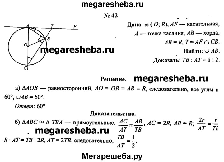 42. Отрезок АС — диаметр окружности, центром которой является точка О. Прямая AF — касательная к окружности, отрезок АВ — хорда окружности, равная ее радиусу, Т = AF ∩ СВ (рис. 33, а), а) Чему равна градусная мера меньшей дуги, концами которой являются точки А и B? б) Докажите, что ВТ : AT =1:2.