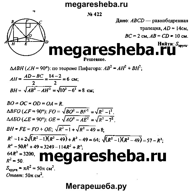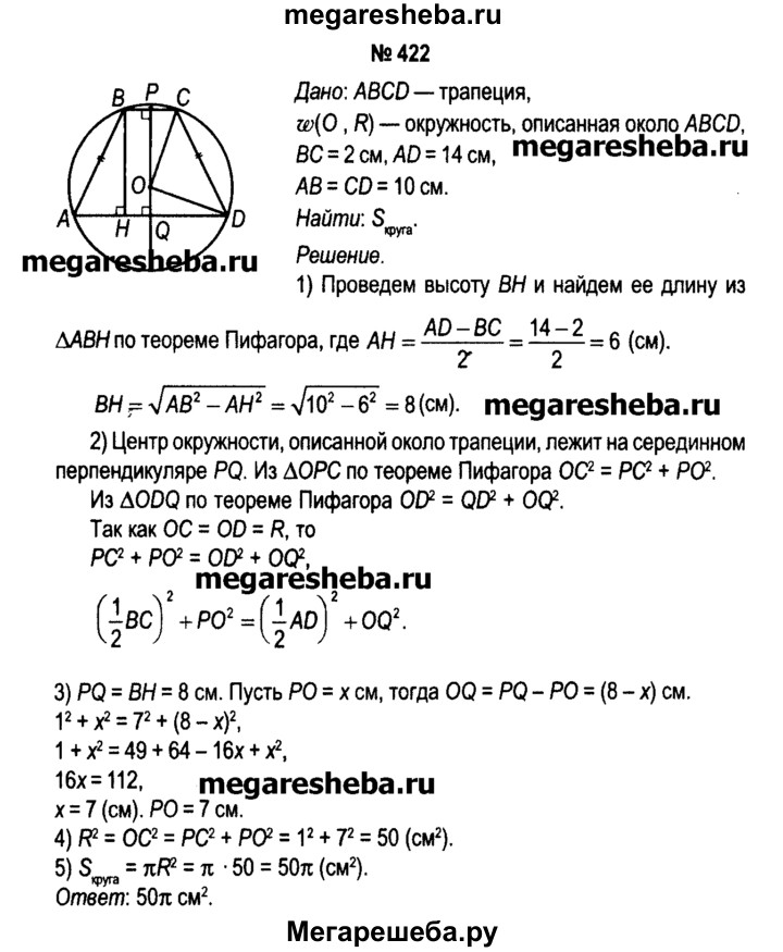 422. Вычислите площадь круга, ограниченного окружностью, описанной около равнобедренной трапеции, длины оснований которой равны 2 см и 14 см, а длина боковой стороны — 10 см.