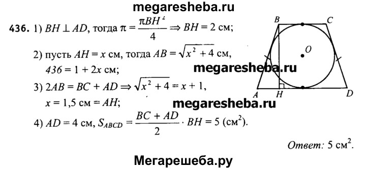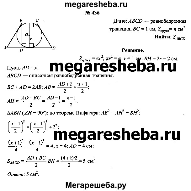436. В равнобедренную трапецию, длина меньшего основания которой равна 1 см, вписан круг, площадь которого равна π см2. Вычислите площадь трапеции