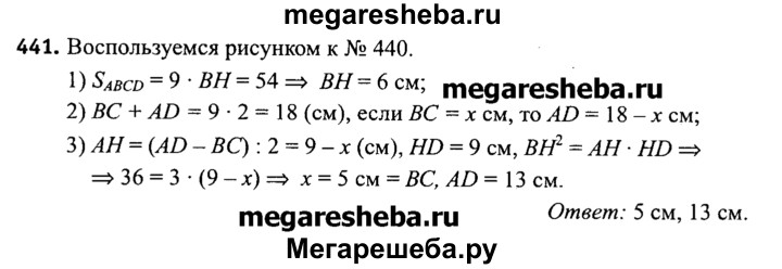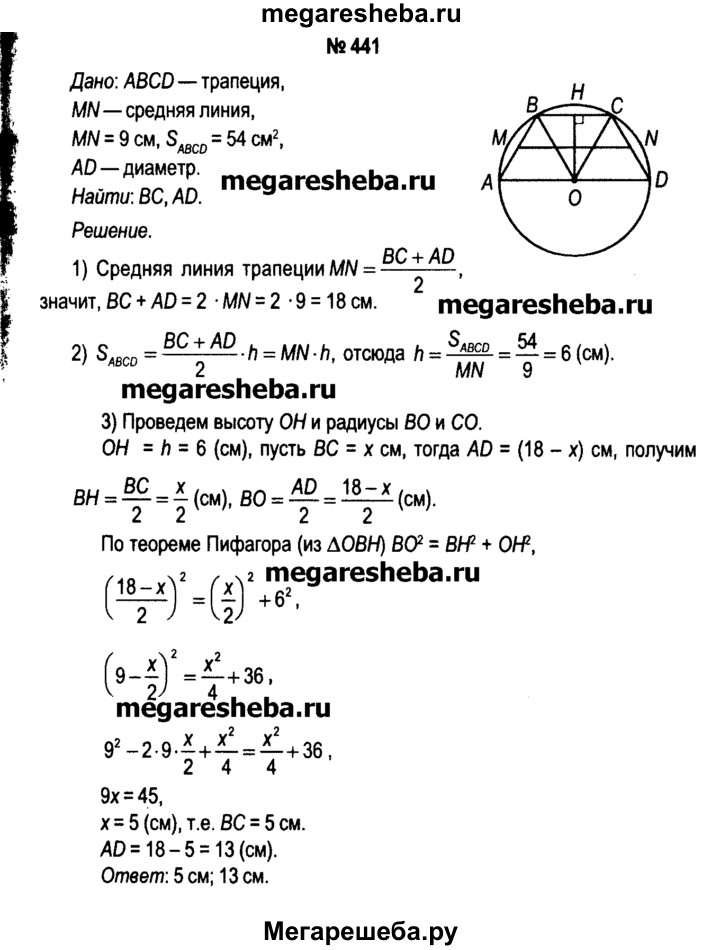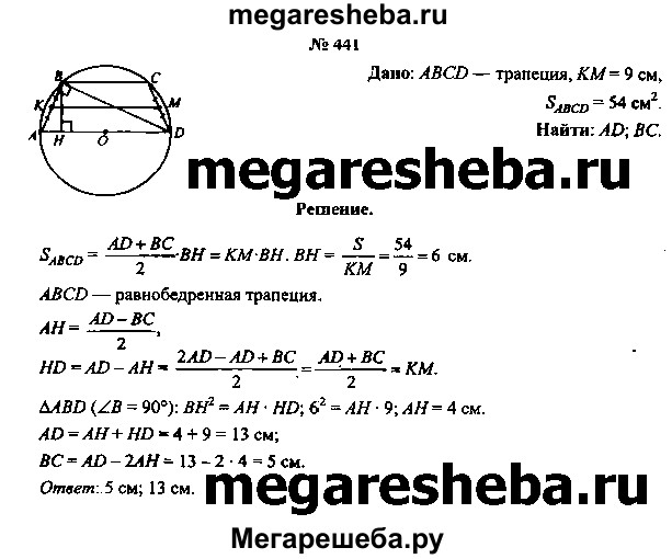 441. Длина средней линии трапеции равна 9 см, а ее площадь — 54 см2. Вычислите длины оснований трапеции, если одно из оснований является диаметром описанной около трапеции окружности.