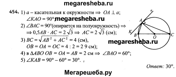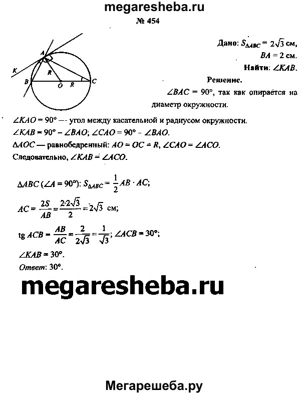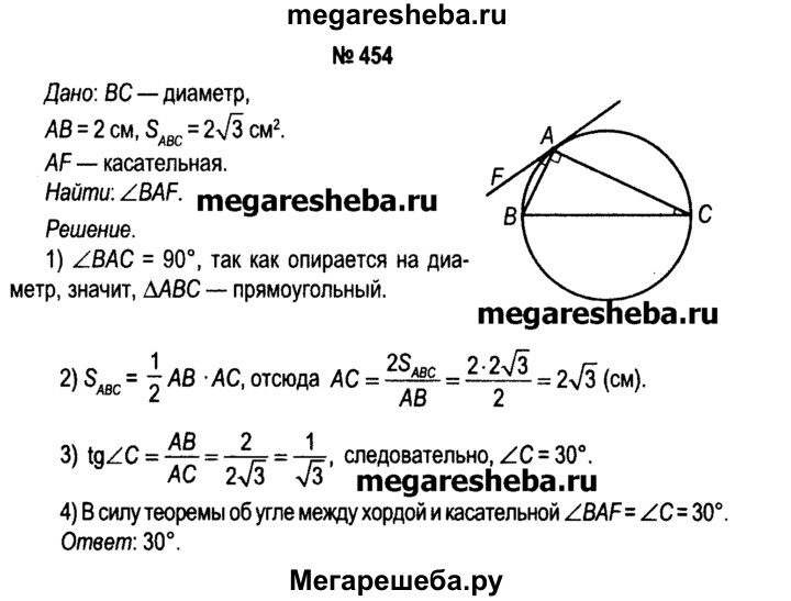 454. Отрезок ВС — диаметр окружности, прямая касается этой окружности в точке А. Известно, что ВА = 2 см и площадь треугольника ABС равна 2√3 см . Вычислите градусную меру угла между прямой ВА и касательной.