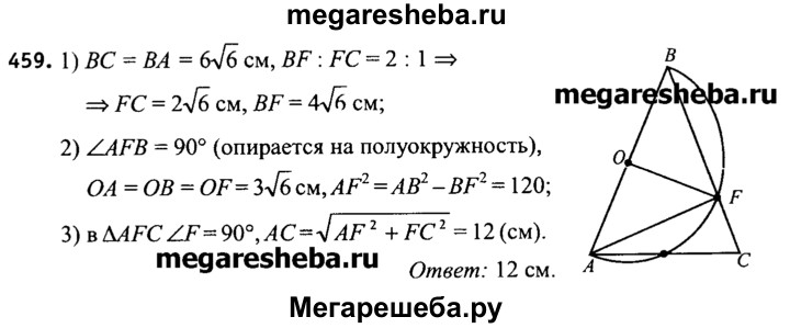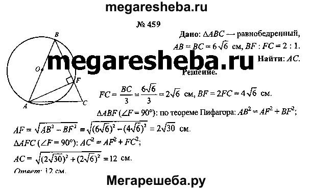 459. В равнобедренном треугольнике ABC с основанием АС длина боковой стороны равна 6√6 см. Окружность, диаметром которой является сторона АВ, пересекает сторону ВС в точке F так, что BF : FC = 2:1. Вычислите длину основания треугольника.