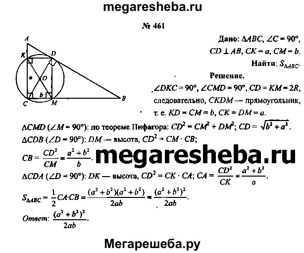 461. Отрезок CD — перпендикуляр, проведенный к гипотенузе прямоугольного треугольника ABC. Отрезок CD является диаметром окружности, которая на катетах АС и ВС отсекает хорды, длины которых а и b. Найдите площадь треугольника ABC.