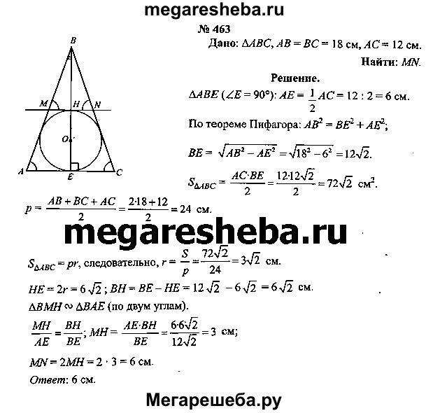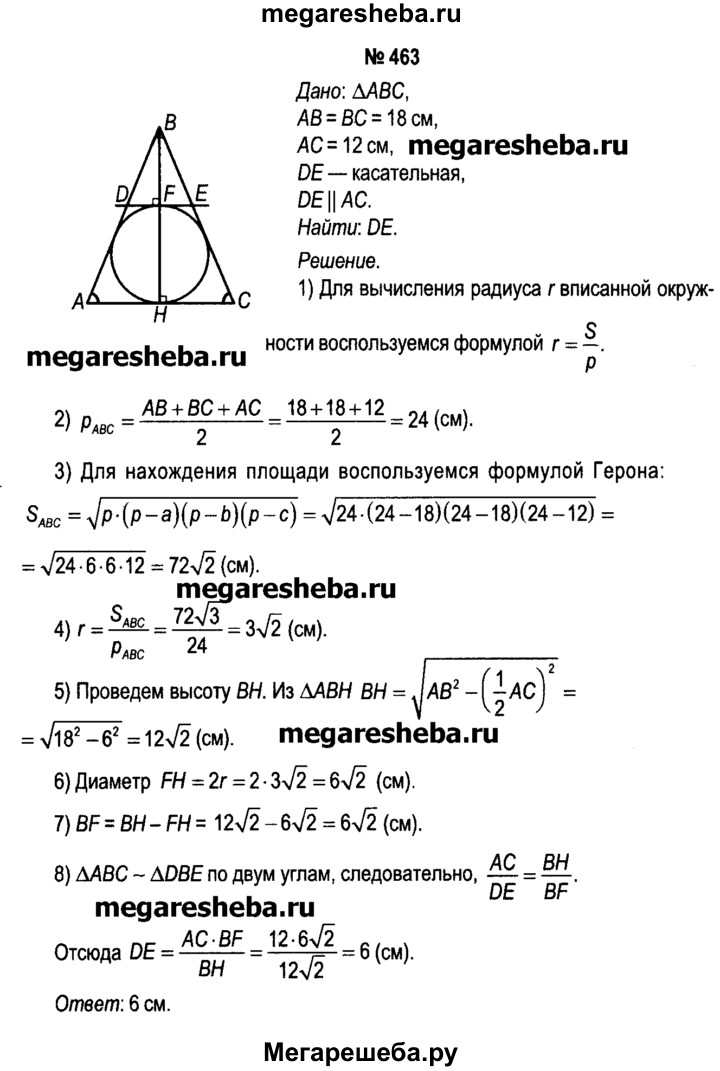 463. В равнобедренный треугольник, длина боковой стороны которого равна 18 см, а длина основания — 12 см, вписана окружность. К ней проведена касательная, параллельная основанию. Вычислите длину отрезка касательной, расположенного внутри треугольника.