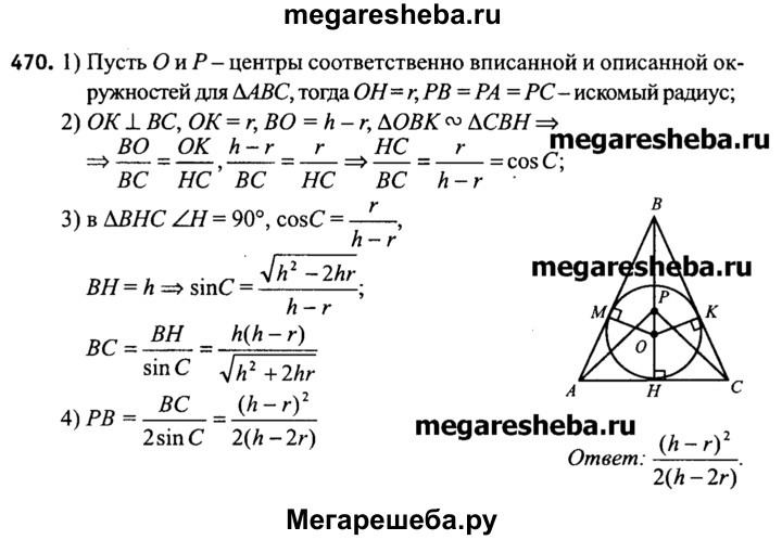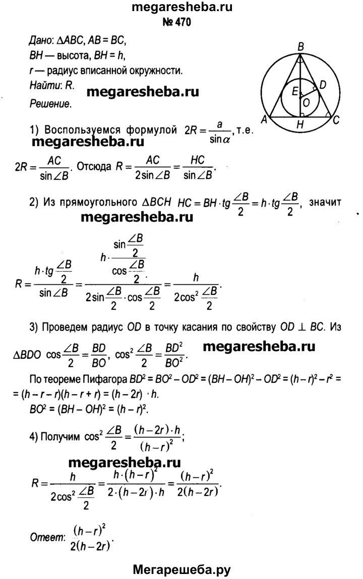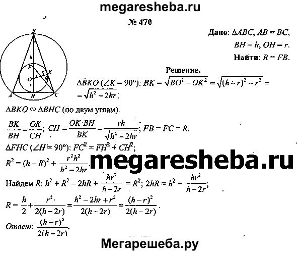470. В равнобедренном треугольнике ABC высота, проведенная к основанию АС, равна h, радиус вписанной окружности равен r. Найдите радиус окружности, описанной около этого треугольника.