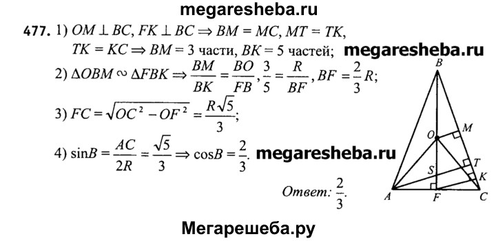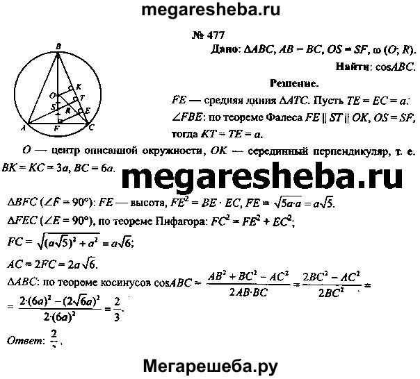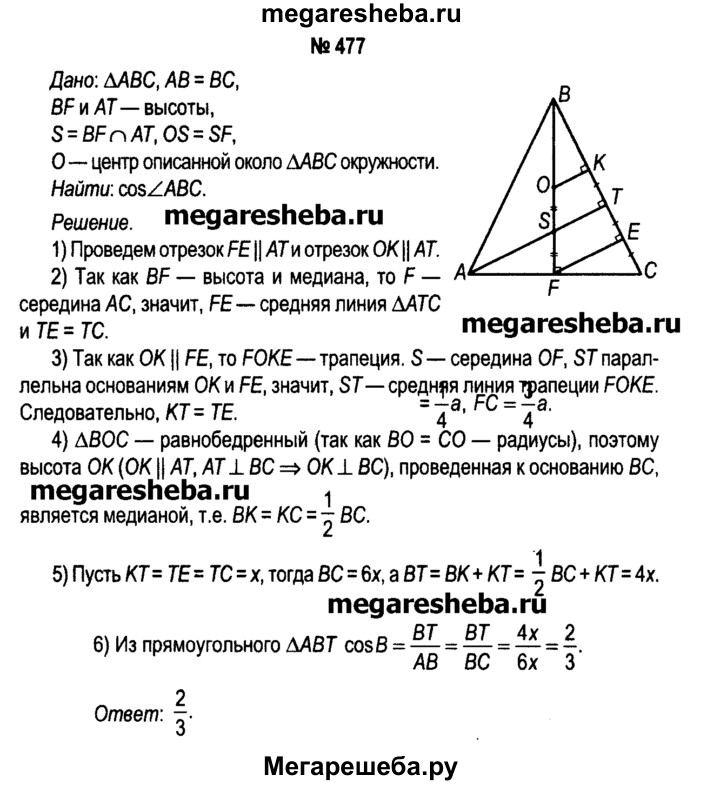 477. В равнобедренном треугольнике АБС с основанием АС высоты BF ж AT пересекаются в точке S. Точка О — центр описанной около треугольника АБС окружности, точка S — середина отрезка OF. Вычислите косинус угла АВС.