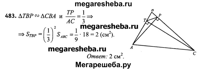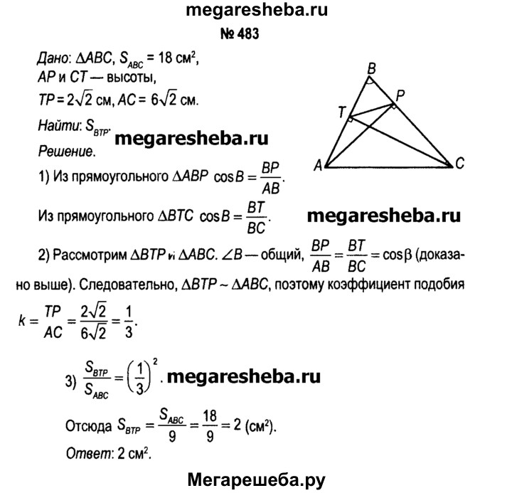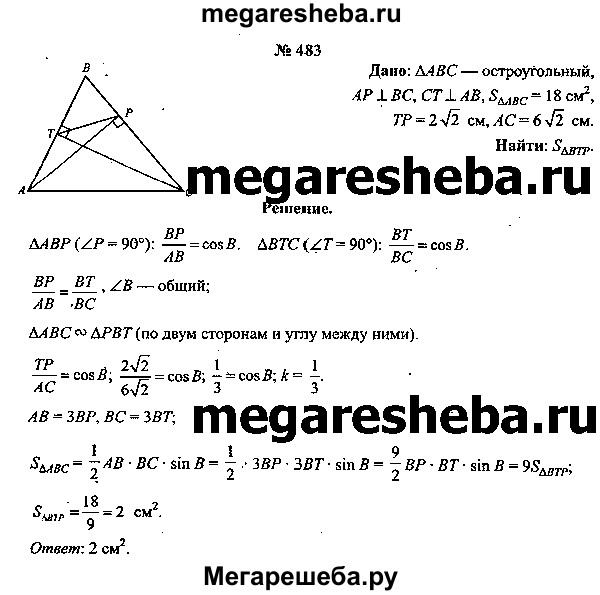 483. Отрезки АР и СТ — высоты остроугольного треугольника АВС. Площадь треугольника ЛВС равна 18 см2, а длины отрезков TP и АС равны 2У2 см и 6 л/2 см соответственно. Вычислите площадь треугольника ВТР.