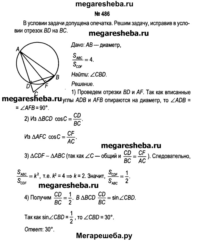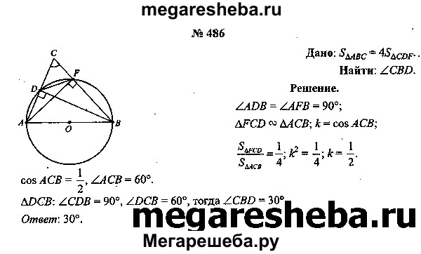 486. Отрезок АВ является диаметром круга, а точка С лежит вне этого круга. Отрезки АС и BD пересекают границу круга в точках D и F соответственно. Вычислите градусную меру угла CBD, если площадь треугольника АВС в четыре раза больше площади треугольника CDF.