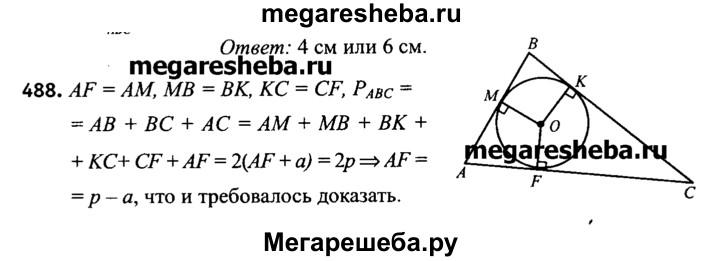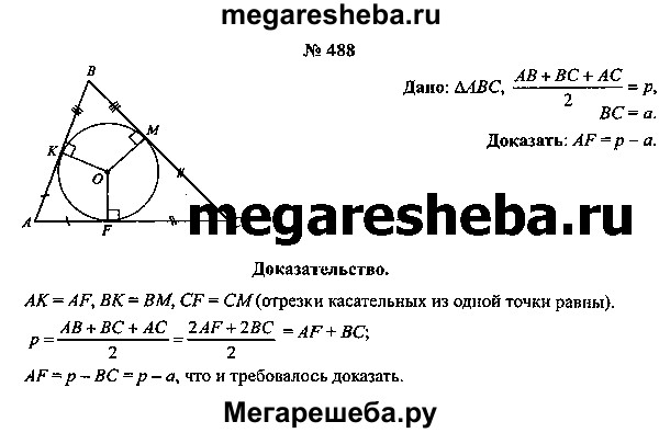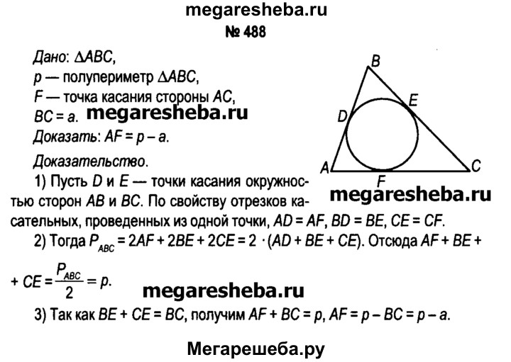 488. Окружность, вписанная в треугольник АВС, касается стороны АС в точке F. Докажите, что AF =р - а, где р — полупериметр треугольника АВС, ВС = а.