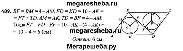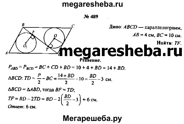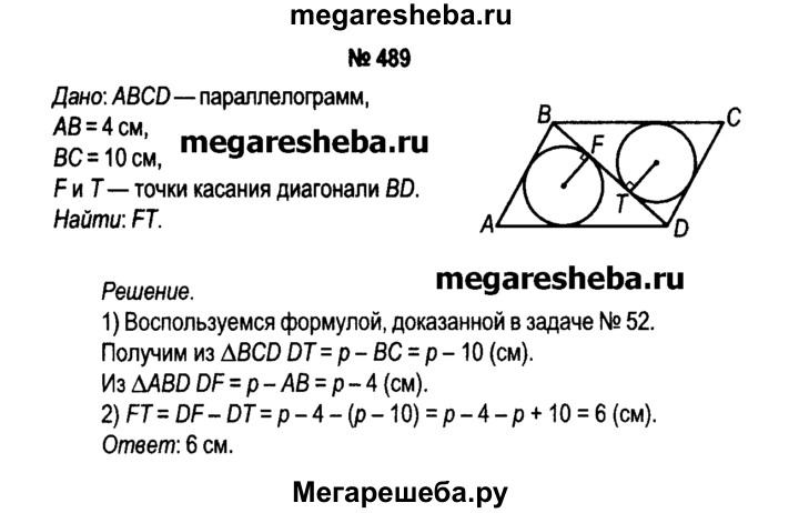 489. В параллелограмме ABCD длины сторон АВ и ВС равны 4 см и 10 см соответственно. В треугольники ABD и BCD вписаны окружности, касающиеся диагонали BD в точках F и Т соответственно. Вычислите длину отрезка FT.
