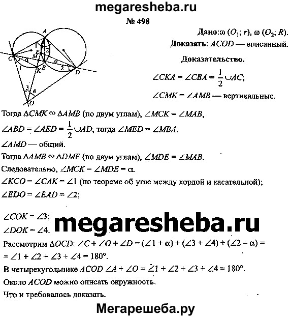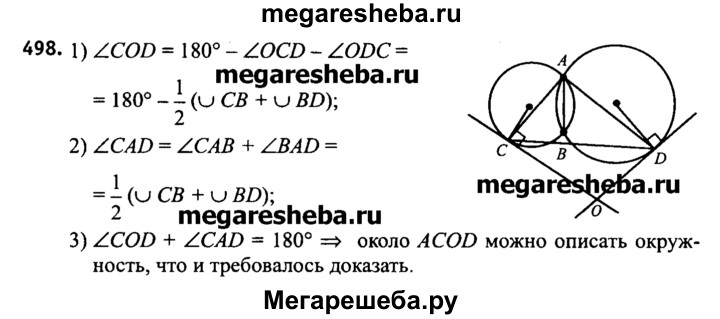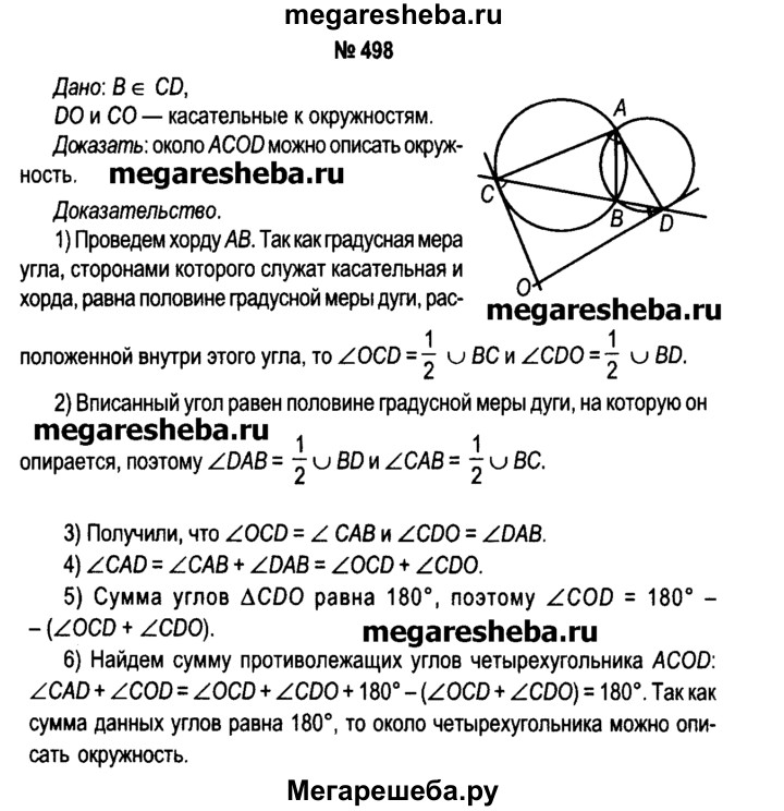 498. Две окружности пересекаются в точках А и B. Через точку B проведена прямая, пересекающая окружности в точках С и D. Касательные к окружностям, проведенные через точки С и D, пересекаются в точке О. Докажите, что около четырехугольника ACOD можно описать окружность.