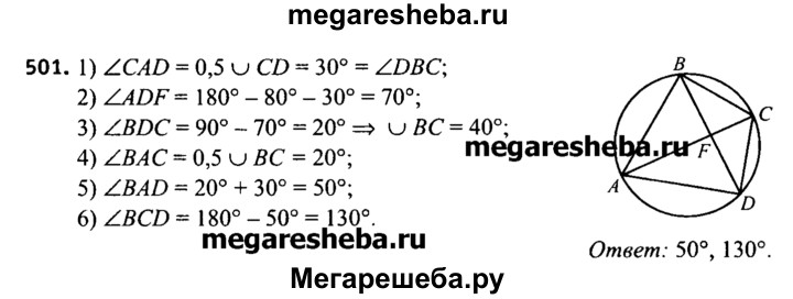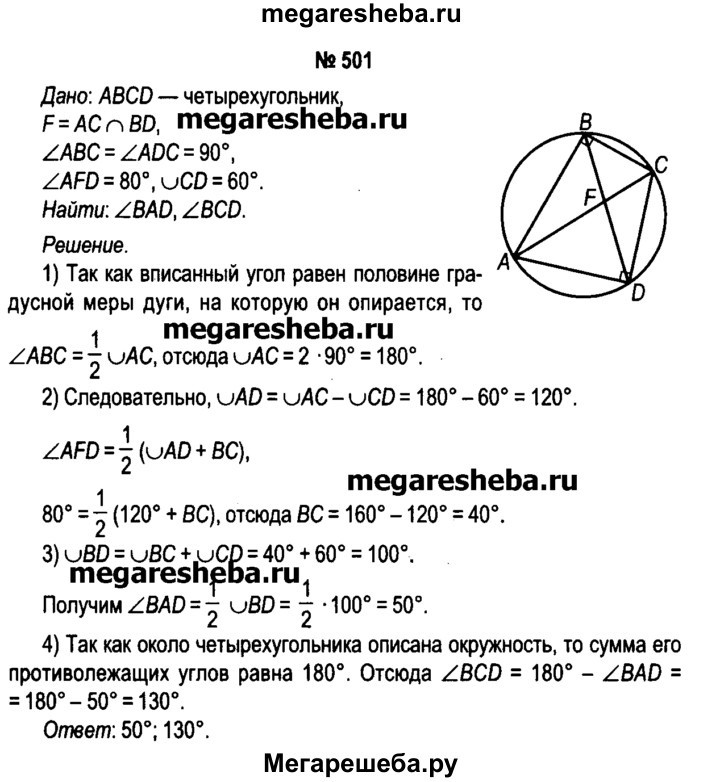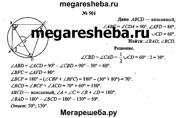 501. Диагонали четырехугольника ABCD, вписанного в окружности, пересекаются в точке F, a угол ABC = угол CDА = 90°. Вычислите градусные меры углов BAD и BCD, если угол AFD = = 80°, а градусная мера дуги CD равна 60°.
