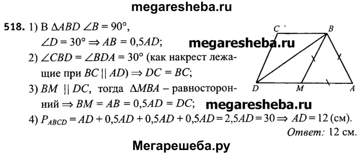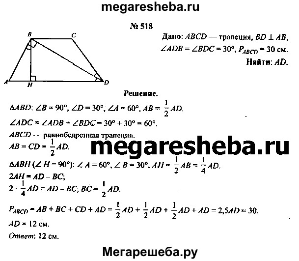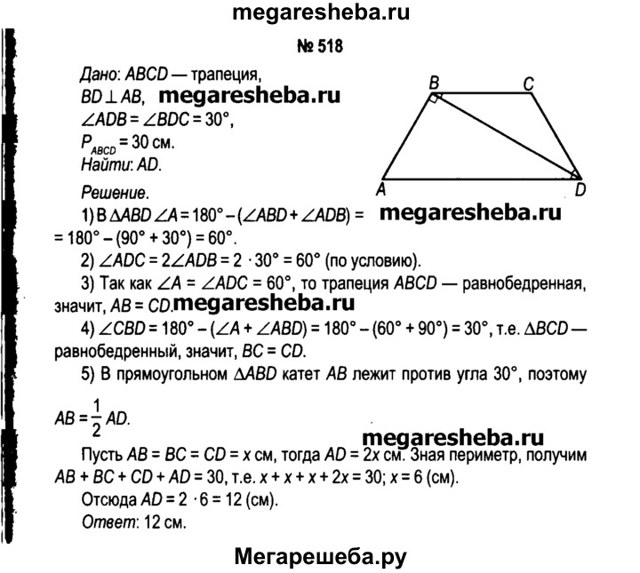 518. Диагональ BD трапеции ABCD перпендикулярна боковой стороне АВ. Вычислите длину основания АВ, если угол ADB = угол BDC = 30° и периметр трапеции равен 30 см.