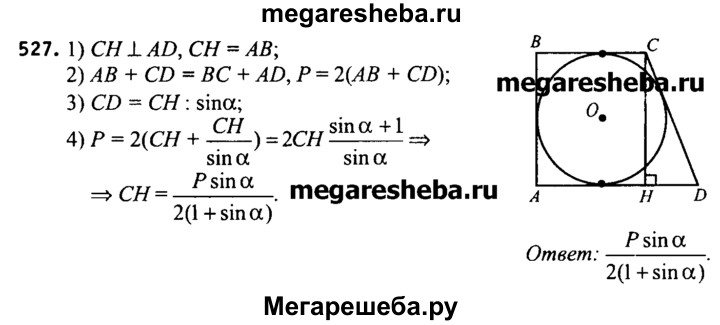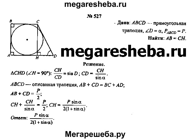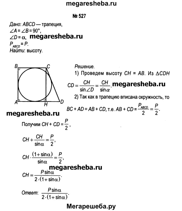 527. Около окружности описана прямоугольная трапеция, градусная мера острого угла которой равна α. Найдите высоту трапеции, если ее периметр равен Р.