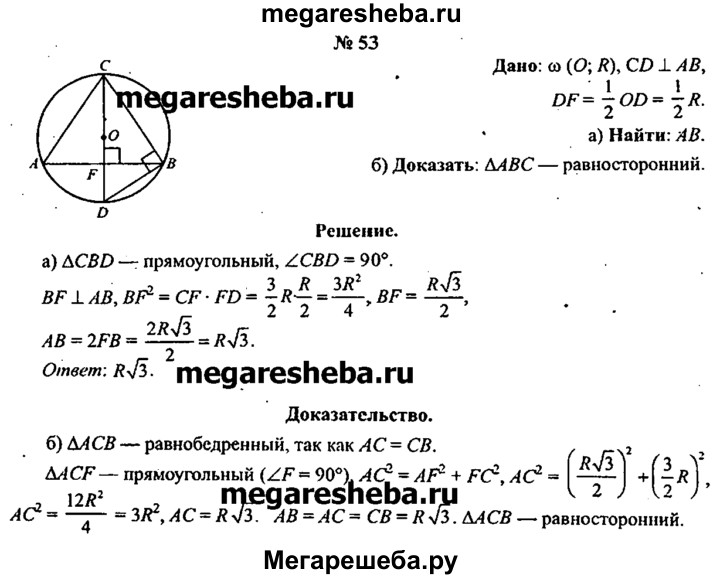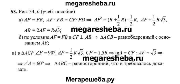 53. Диаметр CD окружности перпендикулярен хорде АВ и пересекает ее в точке F, которая является серединой радиуса OD (рис. 34, б), а) Найдите длину хорды АВ, если радиус окружности равен R. б) Докажите, что треугольник ABC является равносторонним.