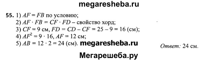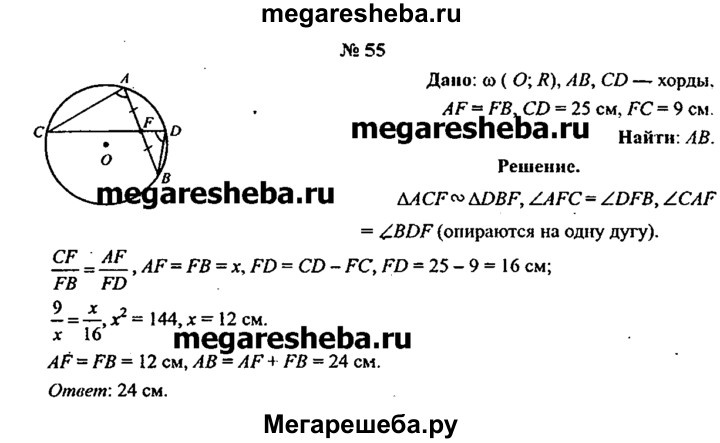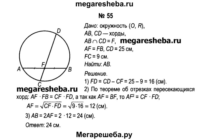 55. Хорды АВ и CD окружности пересекаются в точке F, которая является серединой хорды АВ. Вычислите длину хорды АВ, если CD = 25 см и FC = 9 см.