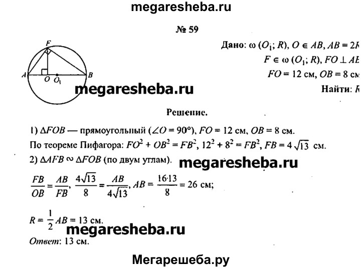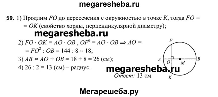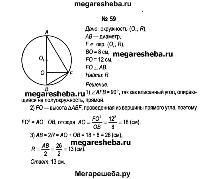 59. Точка О — основание перпендикуляра, проведенного из точки F окружности к ее диаметру АВ. Вычислите радиус окружности, если ВО = 8 см и FO =12 см.
