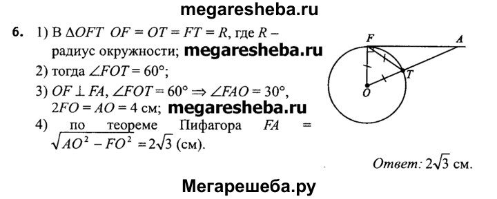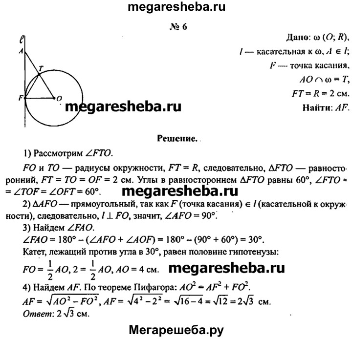 6. Точка F — точка касания прямой l и окружности, центром которой является точка О. Отрезок АО (А∈ l) пересекает окружность в точке Т, а отрезок FT равен радиусу окружности. Вычислите длину отрезка AF, если FT = 2 см.