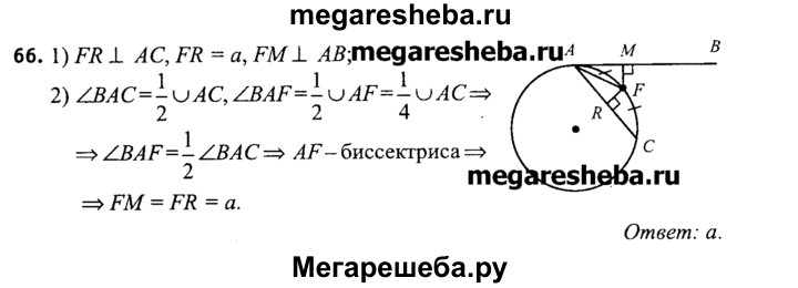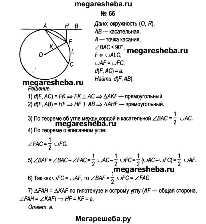 66. Прямая АВ касается окружности в точке А. Точка С лежит на окружности так, что угол ВАС является острым. Точка F лежит на дуге АС и во внутренней области острого угла ВАС так, что ∪AF = ∪FC. Найдите расстояние от точки F до касательной, если d(F, АС) = а.