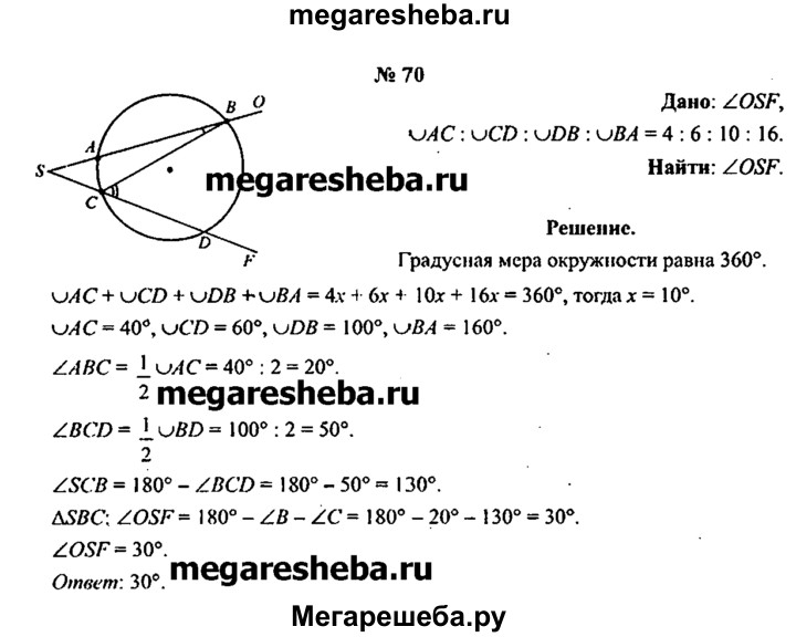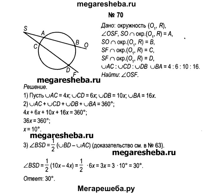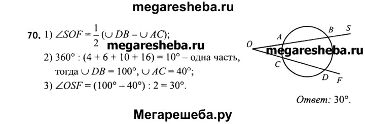 70. Стороны SO и SF угла OSF пересекают окружность в точках А, В и С, D соответственно. Градусные меры дуг АС, CD, DB и ВА в указанном порядке находятся в отношении 4 : 6 : 10 : 16. Вычислите градусную меру угла OSF.