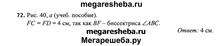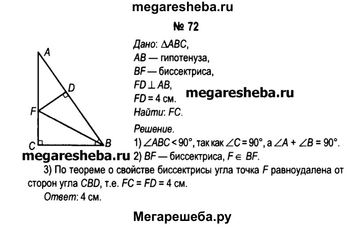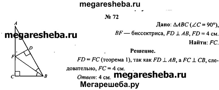 72. Отрезок BF — биссектриса прямоугольного треугольника ABC с гипотенузой АВ. Длина перпендикуляра FD, проведённого к прямой АВ, равна 4 см (рис. 40, а), Вычислите длину отрезка FC.