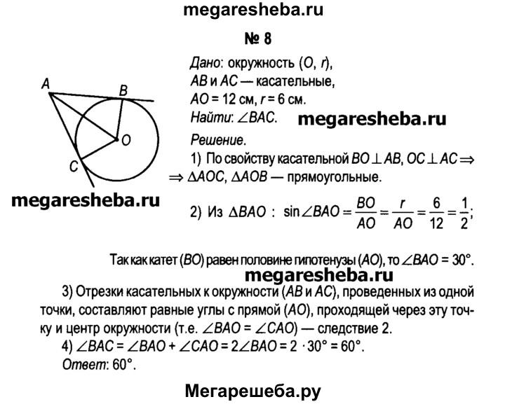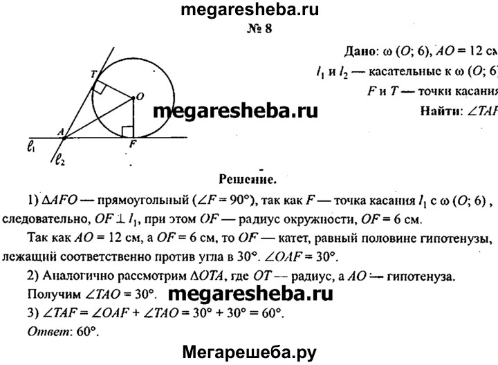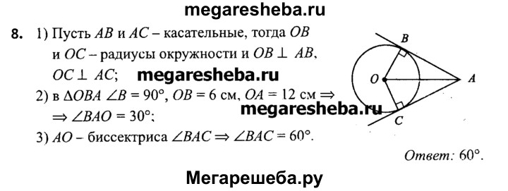 8. Точка А и окружность радиуса 6 см лежат в плоскости, расстояние от точки А до центра окружности равно 12 см. Вычислите градусную меру угла между касательными к окружности, проведенными через точку А.