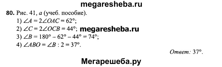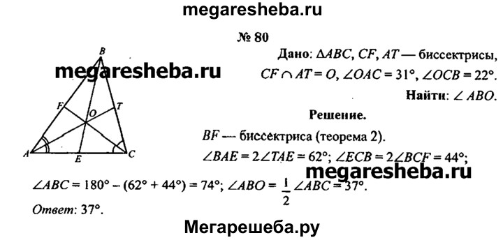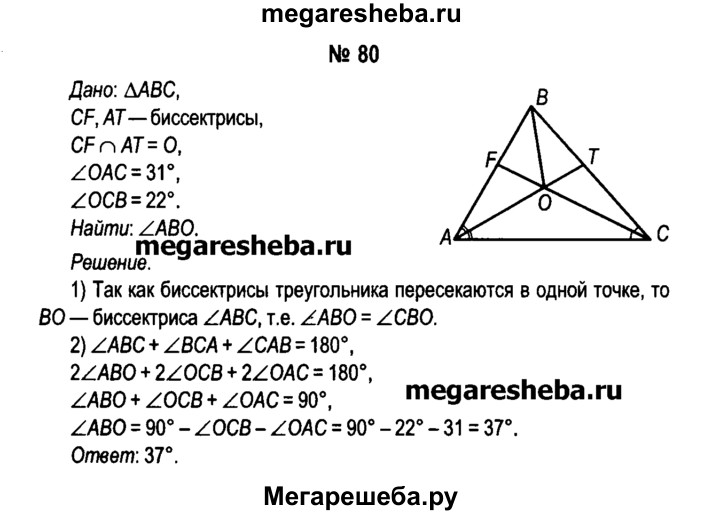 80. В треугольнике ABC биссектрисы CF и AT пересекаются в точке О (рис. 41, а). Вычислите градусную меру угла АВО, если угол OAC = 31°, угол OCB = 22°.