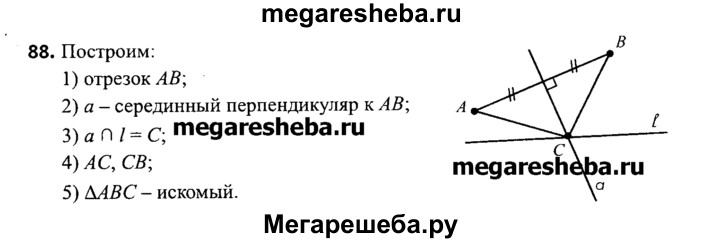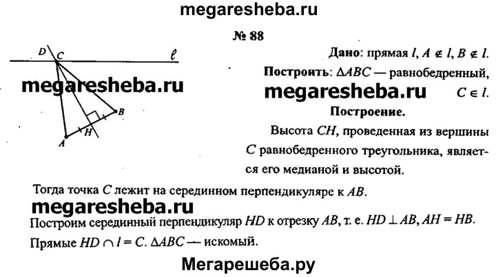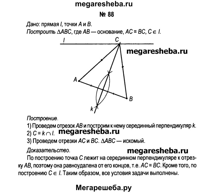 88. Точки А и B лежат по одну сторону от прямой l. Постройте равнобедренный треугольник, основанием которого является отрезок АВ, а вершина лежит на прямой l .