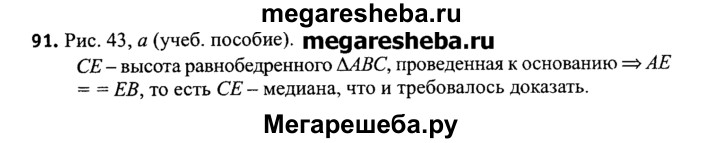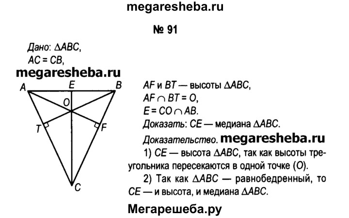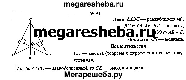 91. Высоты AF и ВТ равнобедренного треугольника АВС (АС = ВС) пересекаются в точке О и Е = СО ∩ АВ (рис. 43, а). Докажите, что отрезок СЕ — медиана треугольника АВС.