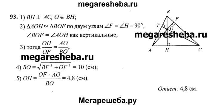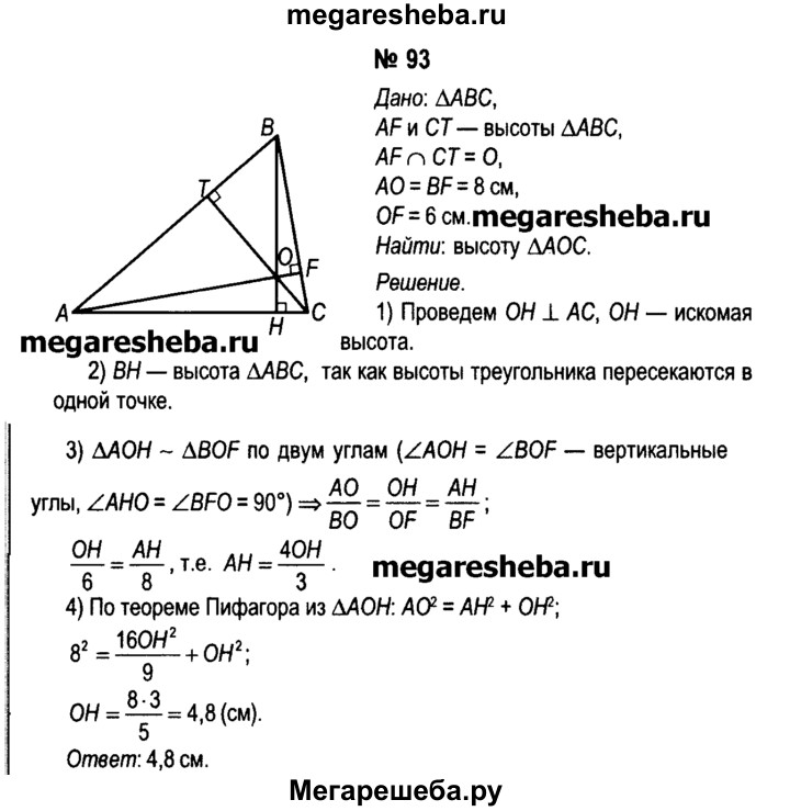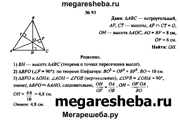 93. Высоты AF и СТ остроугольного треугольника АВС пересекаются в точке О. Вычислите высоту треугольника АОС, проведенную из вершины О, если АО = BF = 8 см, OF = 6 см.