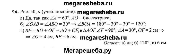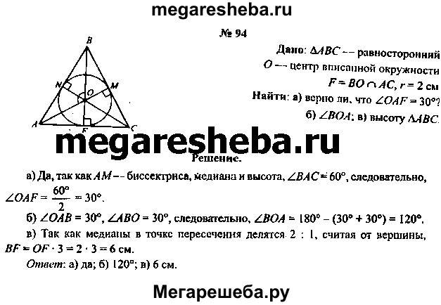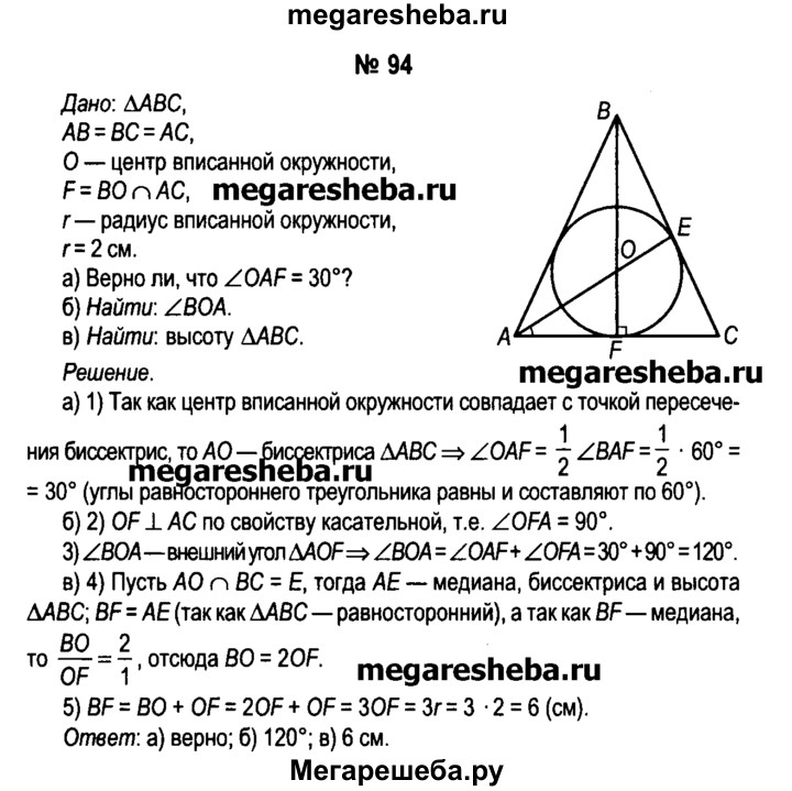 94. Точка О — центр окружности, вписанной в равносторонний треугольник ABC, F = ВО ∩ АС (рис. 50, а), а) Верно ли, что угол OAF = 30°? б) Вычислите градусную меру угла BOA. в) Вычислите высоту треугольника АВС, если радиус вписанной в него окружности равен 2 см.