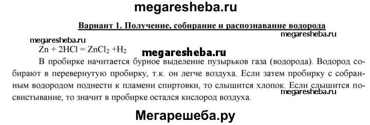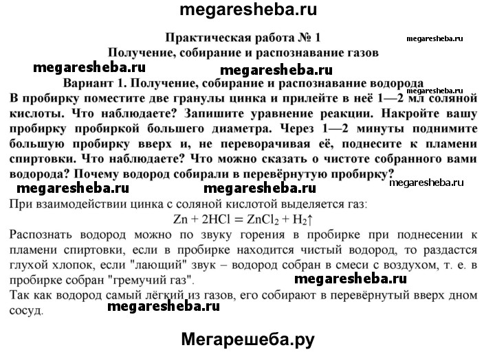Практическая работа №1. Получение, собирание и распознавание газов. Вариант 1. Получение, собирание и распознавание водорода. В пробирку поместите две гранулы цинка и прилейте в неё 1—2 мл соляной кислоты. Что наблюдаете? Запишите уравнение реакции. Накройте вашу пробирку пробиркой большего диаметра. Через 1—2 минуты поднимите большую пробирку вверх и, не переворачивая её, поднесите к пламени спиртовки. Что наблюдаете? Что можно сказать о чистоте собранного вами водорода? Почему водород собирали в перевёрнутую пробирку?