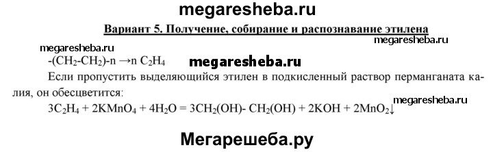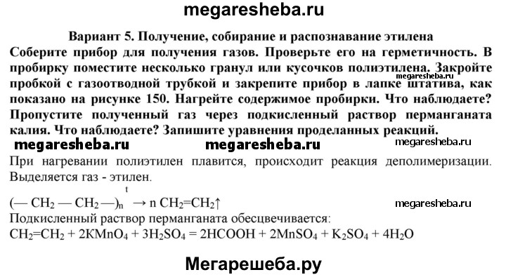 Вариант 5. Получение, собирание и распознавание этилена. Соберите прибор для получения газов. Проверьте его на герметичность. В пробирку поместите несколько гранул или кусочков полиэтилена. Закройте пробкой с газоотводной трубкой и закрепите прибор в лапке штатива, как показано на рисунке 150. Нагрейте содержимое пробирки. Что наблюдаете? Пропустите полученный газ через подкисленный раствор перманганата калия. Что наблюдаете? Запишите уравнения проделанных реакций.