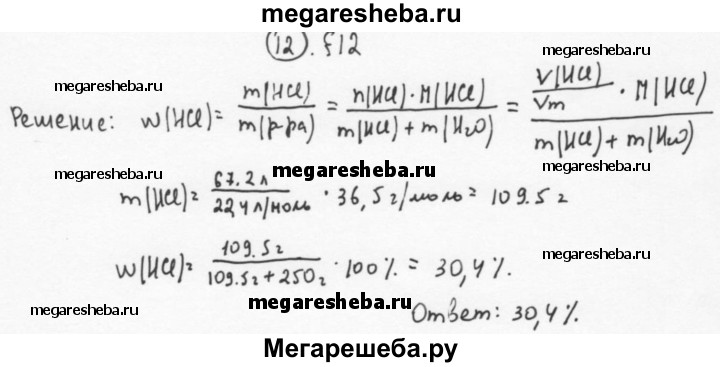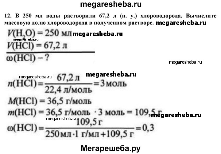 12. В 250 мл воды растворили 67,2 л (н. у.) хлороводорода. Вычислите массовую долю хлороводорода в полученном растворе.