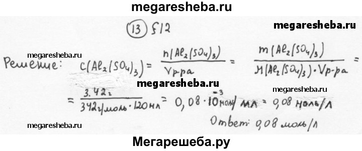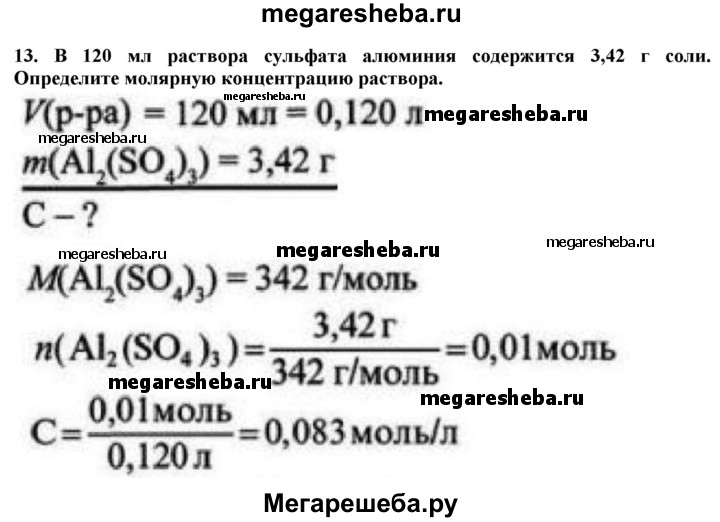 13. В 120 мл раствора сульфата алюминия содержится 3,42 г соли. Определите молярную концентрацию раствора.