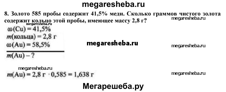 8. Золото 585 пробы содержит 41,5% меди. Сколько граммов чистого золота содержит кольцо этой пробы, имеющее массу 2,8 г?