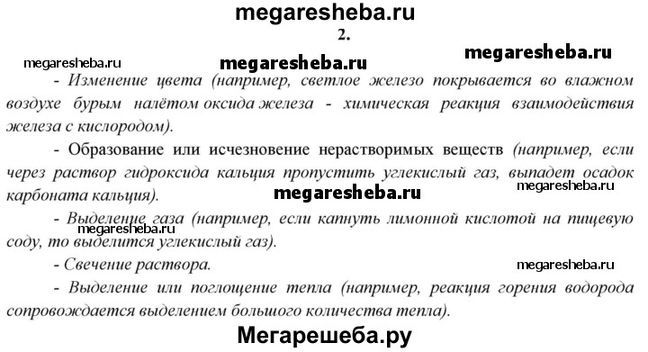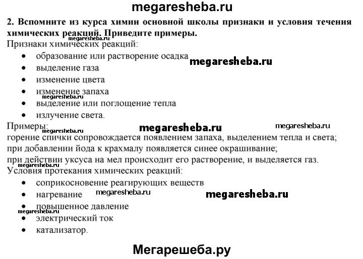2. Вспомните из курса химии основной школы признаки и условия течения химических реакций. Приведите примеры.