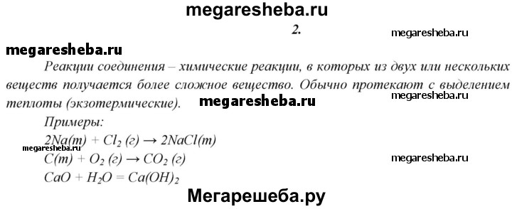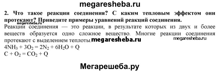 2. Что такое реакции соединения? С каким тепловым эффектом они протекают? Приведите примеры уравнений реакций соединения.