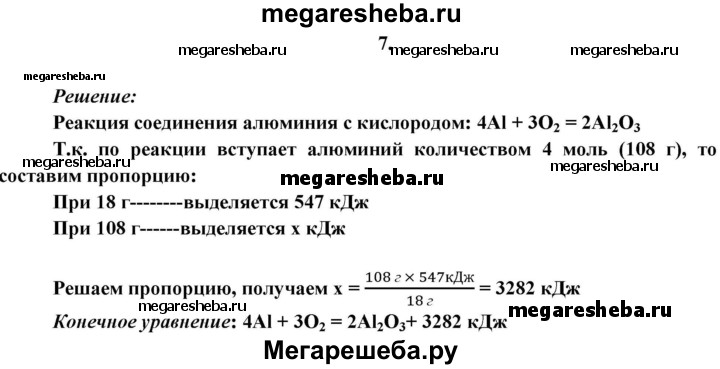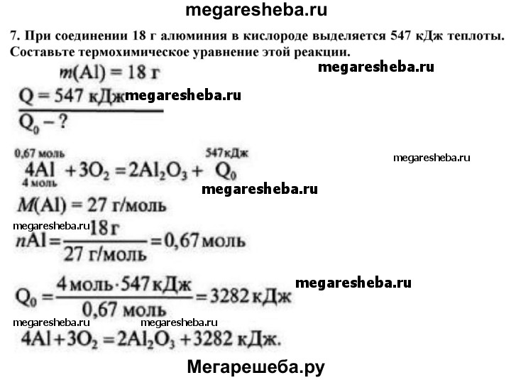7. При соединении 18 г алюминия в кислороде выделяется 547 кДж теплоты. Составьте термохимическое уравнение этой реакции.