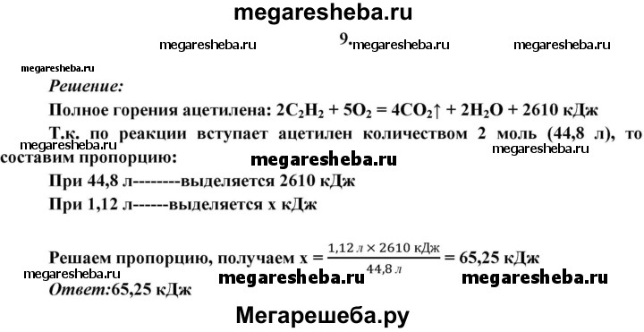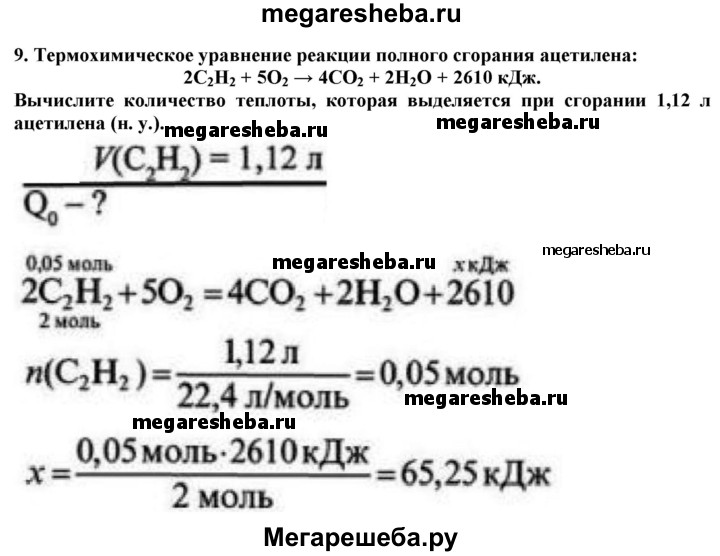 9. Термохимическое уравнение реакции полного сгорания ацетилена: 2С2Н2 + 5О2 → 4CO2 + 2H2O + 2610 кДж. Вычислите количество теплоты, которая выделяется при сгорании 1,12 л ацетилена (н. у.).