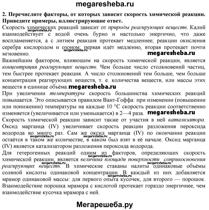 2. Перечислите факторы, от которых зависит скорость химической реакции. Приведите примеры, иллюстрирующие ответ.