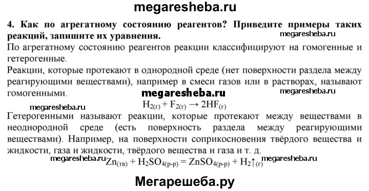4. Как классифицируют реакции по агрегатному состоянию реагентов? Приведите примеры таких реакций, запишите их уравнения.