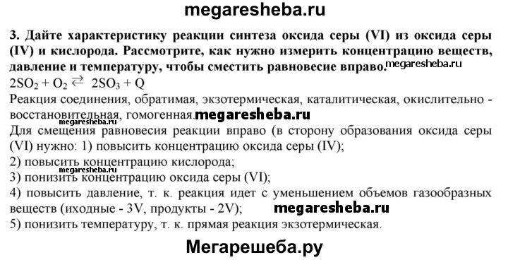 3. Дайте характеристику реакции синтеза оксида серы (VI) из оксида серы (IV) и кислорода. Рассмотрите, как нужно измерить концентрацию веществ, давление и температуру, чтобы сместить равновесие вправо.