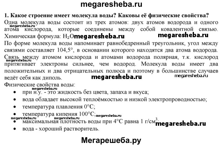 1. Какое строение имеет молекула воды? Каковы её физические свойства?