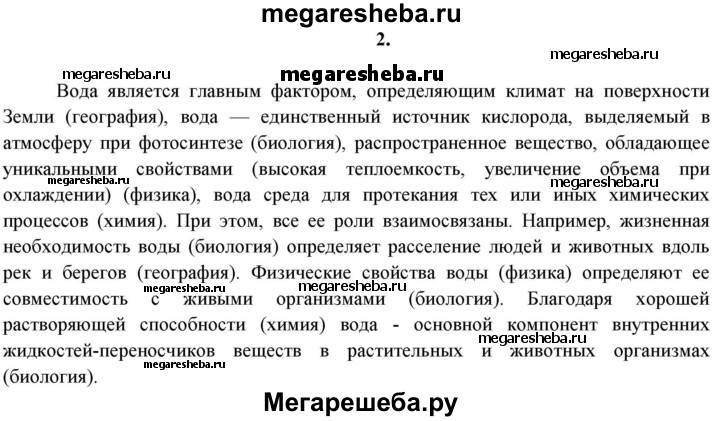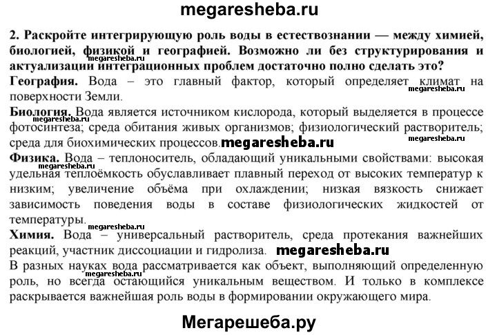 2. Раскройте интегрирующую роль воды в естествознании — между химией, биологией, физикой и географией. Возможно ли без структурирования и актуализации интеграционных проблем достаточно полно сделать это?