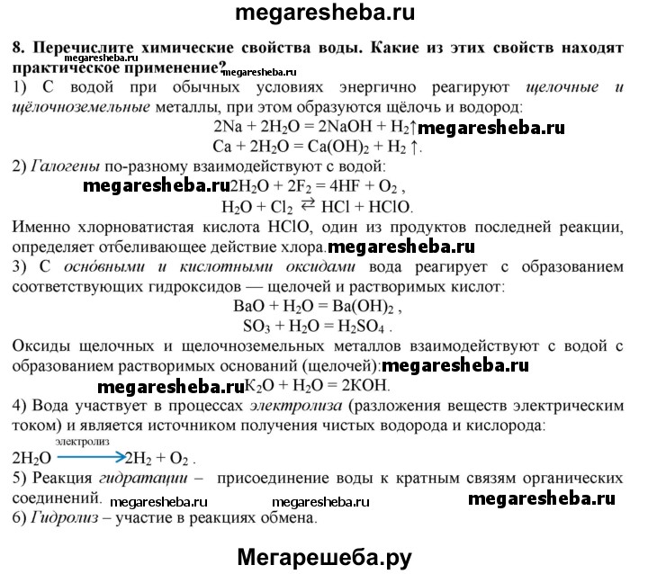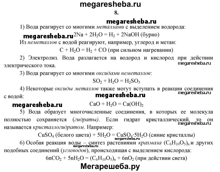 Подробный решебник (ГДЗ) по Химии за 11 (одиннадцатый) класс - готовый ответ Химические реакции Роль воды в химических реакциях - 8. Авторы учебника: Габриелян, Базовый уровень. Издательство: Дрофа 2015.