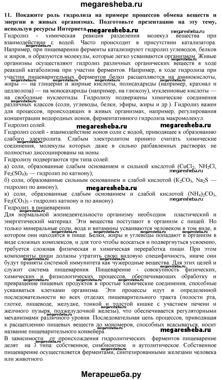 11. Покажите роль гидролиза на примере процессов обмена веществ и энергии в живых организмах. Подготовьте презентацию на эту тему, используя ресурсы Интернета.