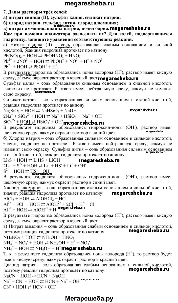 7. Даны растворы трёх солей: а) нитрат свинца (II), сульфат калия, силикат натрия; б) хлорид натрия, сульфид лития, хлорид алюминия; в) нитрат аммония, цианид натрия, иодид бария. Как при помощи индикатора распознать их? Для солей, подвергающихся гидролизу, запишите уравнения соответствующих реакций.